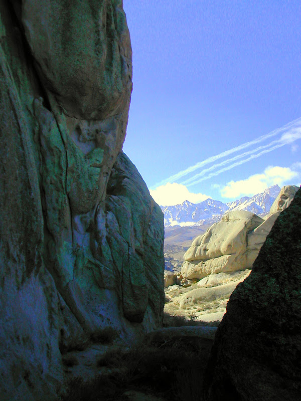 Four days and nights were spent camping in Buttermilk country just outside Bishop. The commute to “class” was a five minute jolt over dirt roads whose underlying rocks jutted out like the sickly concavities of an emaciated body. Nights were cold- sleeping in my car I awoke to frozen water, frozen self and frost on the windows…