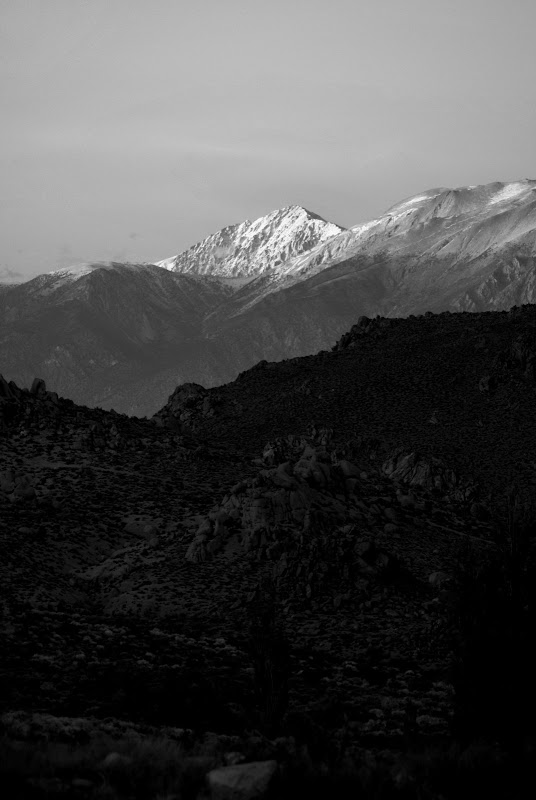 Four days and nights were spent camping in Buttermilk country just outside Bishop. The commute to “class” was a five minute jolt over dirt roads whose underlying rocks jutted out like the sickly concavities of an emaciated body. Nights were cold- sleeping in my car I awoke to frozen water, frozen self and frost on the windows…