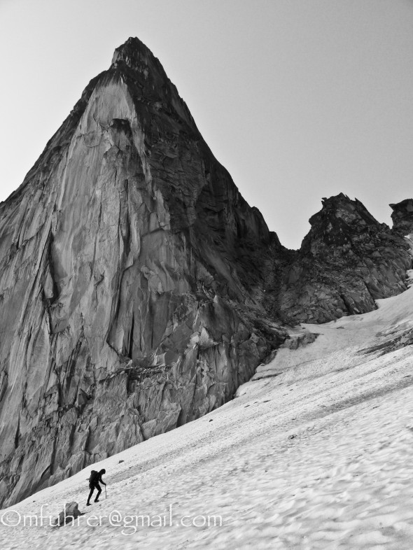 My 250th day of climbing was to be shared with Martin, my first T1D mountaineering partner; our objective, the west ridge of Pidgeon Spire-modestly rated at “only” 5.4 was a long way away and we had to make use of all available daylight to get back at a reasonable time. Stefanie’s cold that she had been nursing for a few days and on the 4 hour approach had taken hold and we decided that it would be better for her to rest in camp and that we would see her in the evening.